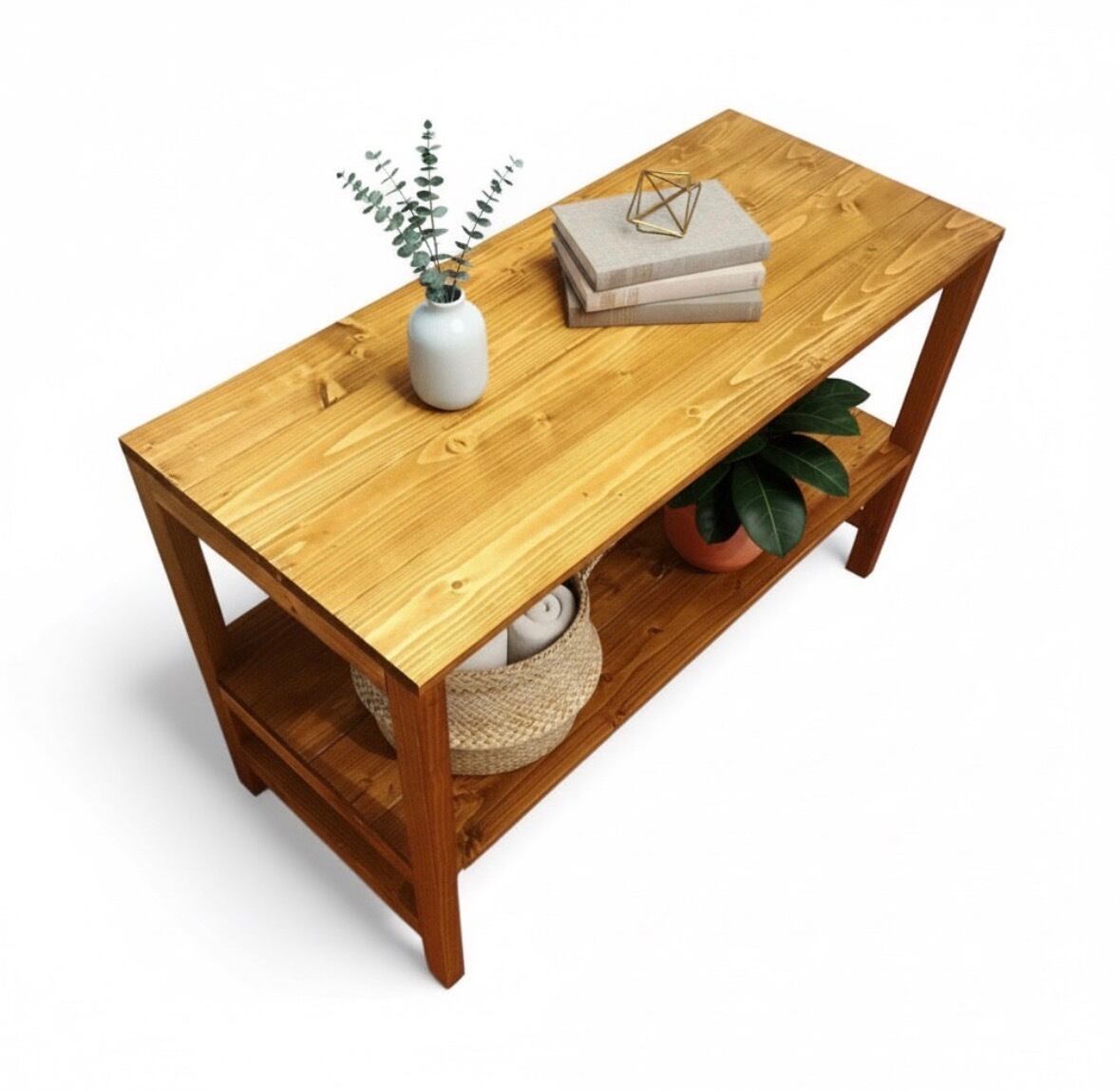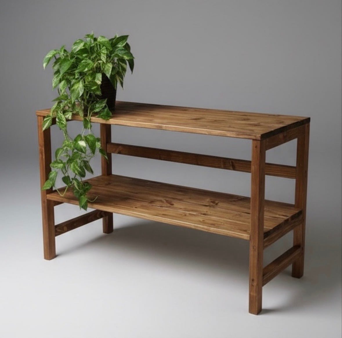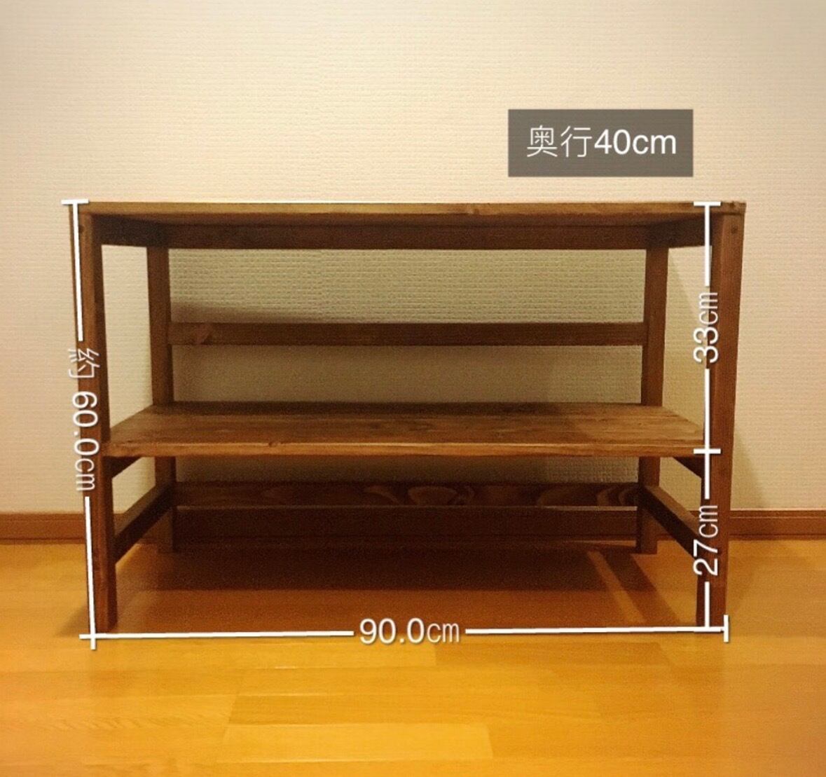 濃いめの、こげ茶ワックス仕上げなので若干の艶があり観葉植物などを置くと緑が映えます。